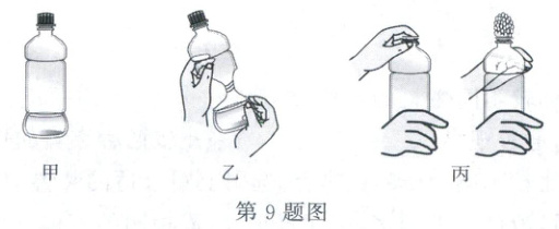 9. 喜欢思考的小明用塑料矿泉水瓶进行了如下游戏探究:瓶中留有少量水,盖上瓶盖(如图甲);扭转瓶子(如图乙);轻轻地旋动瓶盖,瓶盖被瓶内的气体冲出,同时瓶内出现白雾(如图丙)。图乙和图丙所示的过程分别与四冲程内燃机连续的两个冲程相似,这两个冲程是(