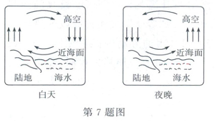 7. 炎炎夏日,小梅来到某座美丽的海滨城市。她发现,在这里白天的风常常从海面吹向陆地,而每到夜晚风却从陆地吹向海面。她利用学过的物理知识进行分析,并画出陆地和海面之间空气流动情况的示意图,如图所示。形成这一现象的主要原因是(