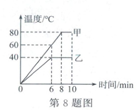 8. 质量和温度都相同的甲、乙两种物质,用同样的加热器进行加热,它们的温度随时间变化的关系图像如图所示,下列说法正确的是(