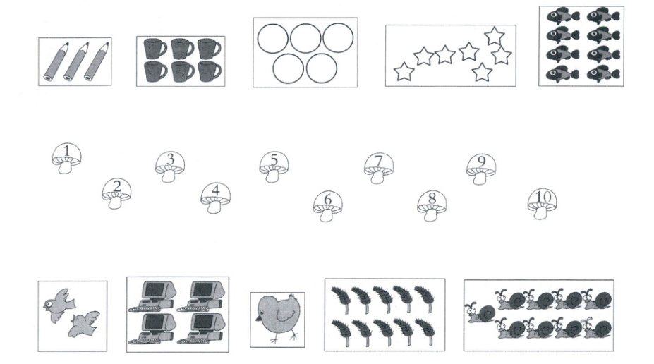 (连线略,对应关系为:铅笔-3,杯子-6,圆圈-5,星星-7,鱼-8,小鸟-2,电脑-4,小鸡-1,草-10,蜗牛-9)