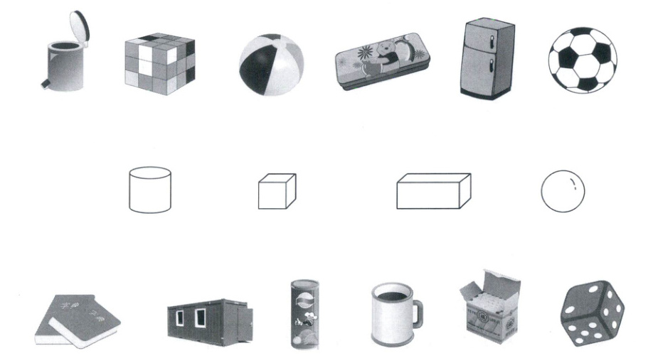垃圾桶---圆柱, 魔方---正方体, 球---球, 文具盒---长方体,冰箱---长方体,足球---球,书---长方体,房子---长方体,饮料罐---圆柱,杯子---圆柱,盒子---长方体,骰子---正方体。