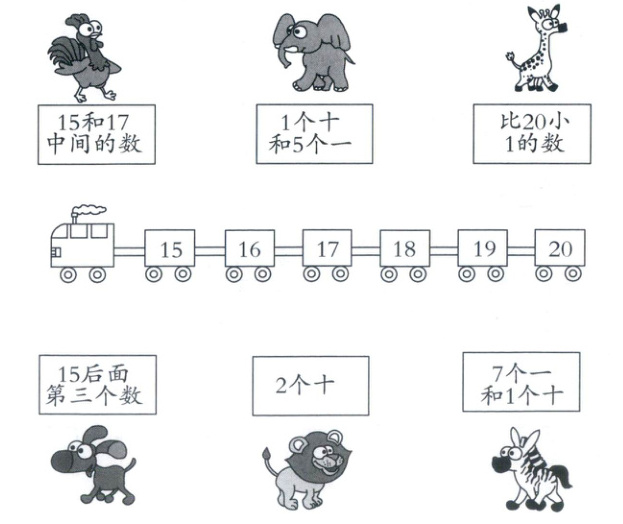 15和17中间的数是16;1个十和5个一是15;比20小1的数是19;15后面第三个数是18(15+3=18);2个十是20;7个一和1个十是17(10+7=17)。连线如下:公鸡连16,大象连15,长颈鹿连19,小狗连18,狮子连20,斑马连17。