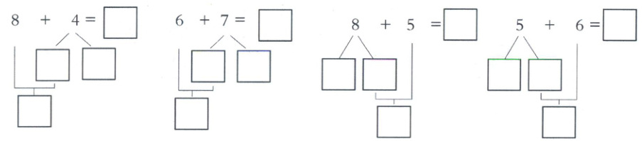 8+4:将4分成2和2,8+2=10,10+2=12,结果12;