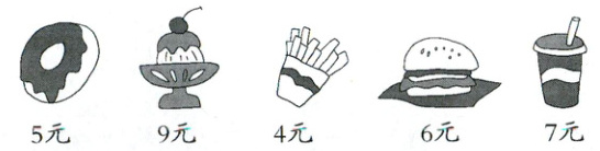 2. 9元+5元=14元,圈冰淇淋和甜甜圈(或7元+6元+1元,题目中无1元物品,应为9+5=14或6+4+4=14,圈冰淇淋和甜甜圈或汉堡和两个薯条)