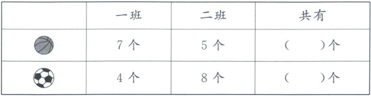 4. 学校买了一些篮球和足球分给一年级的两个班,请填表。