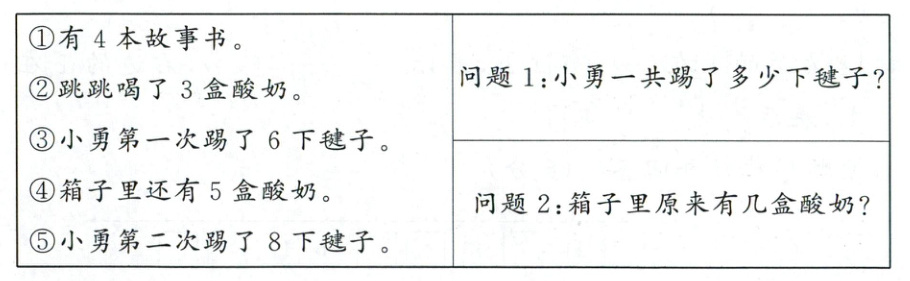 问题1:选择条件③⑤ 列式:6+8=14(下) 问题2:选择条件②④ 列式:5+3=8(盒)