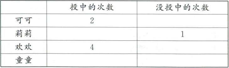 童童投中的次数比可可的多,比欢欢的少。将表格填写完整。