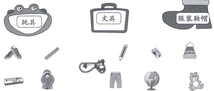 玩具——玩具枪、小熊;文具——尺子、铅笔、卷笔刀、文具盒、地球仪;服装鞋帽——鞋子、帽子、外套、裤子。