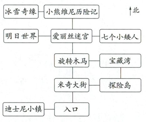 (3)先向北走到米奇大街,再向北走到旋转木马,再向东走到宝藏湾。(答案不唯一)