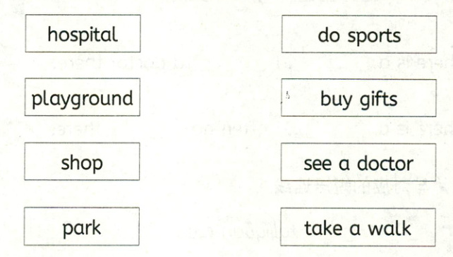 五、将下列场所与对应的活动连线,并把句子补充完整。