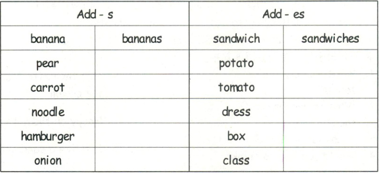 pears carrots noodles hamburgers onions potatoes tomatoes dresses boxes classes