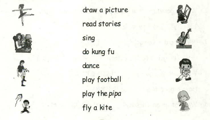 左上图-dance;左中图-read stories;左下图-play football;左底图-fly a kite;右上图-draw a picture;右中图-play the pipa;右下图-do kung fu;右底图-sing