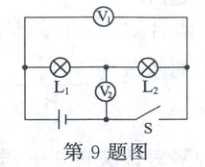 9. 如图所示,电源电压不变,闭合开关 S,电压表$ V_1 $的示数为 6 V,电压表$ V_2 $的示数为 2 V。下列说法正确的是(