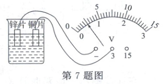 7. (2025·银川期末)如图在烧杯中加入盐水,将铜片和锌片放在盐水中,这就是一个电池。试着用电压表测量这个自制电池的电压,下列说法正确的是(