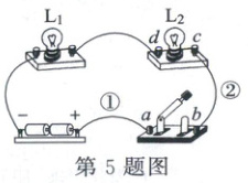 5. (2023·盐城中考)在如图所示的电路中,闭合开关,灯泡都不发光。为了寻找灯泡不亮的原因,将一根完好的导线一端固定在电源正极,另一端依次接触 a、b、c、d 四个接线柱,发现只有与 d 接线柱接触时灯泡$ L_1 $才发光。若电路中只有一处开路,位置可能是(