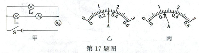 17. 如图甲所示的电路中,当开关 S 闭合后,电流表$ A_1 $的指针偏转如图乙所示,电流表$ A_2 $的指针偏转如图丙所示,则通过$ L_1 $的电流是