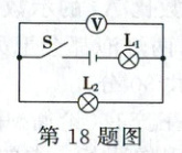 18. 如图所示的电路中,电源电压是 3 V,闭合开关 S 后,两灯泡均发光,电压表的示数是 1.4 V,此时灯泡$ L_1 $两端的电压是