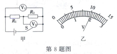 8. 如图甲所示的电路中,当闭合开关 $ S $ 后,两个电压表的指针偏转情况均如图乙所示,则电阻 $ R_1 $ 和 $ R_2 $ 的比值为(