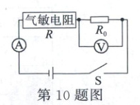 10. (2025·南京期末)物理兴趣小组在老师的指导下设计了天然气泄漏检测电路,如图所示。电源电压恒定不变,$ R_0 $ 为定值电阻,$ R $ 为气敏电阻,$ R $ 的阻值随天然气浓度的增大而减小,则天然气(