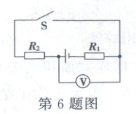 6. 在如图所示的电路中,电源电压保持不变,$ R_1 = 4 \Omega $,$ R_2 = 8 \Omega $,开关 $ S $ 闭合后电压表的示数为 $ 4 \, V $,则电源电压为(