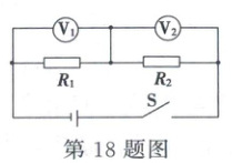 18. 如图所示的电路中,电阻$R_1$的阻值为4Ω,当开关S闭合后,电压表$V_1$的示数为2V,电压表$V_2$的示数为1V,电源两端的电压为