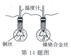 14. 如图所示是“探究电流通过导体产生的热量与导体电阻关系”的实验装置,铜丝的电阻小于镍铬合金丝的电阻,铜丝和镍铬合金丝串联浸在相同质量和相同初温的煤油中,两烧瓶里各插入一支温度计,通电一定时间后,可以看到