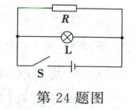 24. (6分)如图所示,小灯泡L的额定电压为3.8V,定值电阻R的阻值为20Ω,闭合开关S,流过定值电阻R的电流为0.1A,流过小灯泡L的电流为0.2A。求: