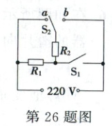 26. (8分)一台热水器有三个挡位,分别为低温挡、中温挡和高温挡,内部简化电路如图所示$,R_1$和$R_2$均为电热丝$,R_1= 88Ω,R_2= 22Ω。$