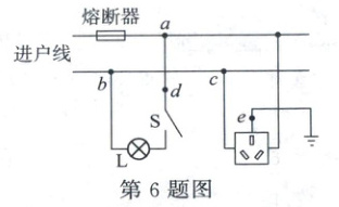 B 解析:熔断器通常与进户线的火线相连,因此a点所在的进户线是火线,故A错误;断开开关S,用测电笔检测d点时,由于d点还与火线连接,因此氖管发光,故B正确;若e点所在导线开路,会导致用电器在使用时与地线断开,易造成触电事故,这时三孔插座不能安全使用,故C错误;闭合开关S,灯泡L不发光,可能是进户线的火线开路,或进户线零线b点左侧开路,只有导线bc间开路不会影响灯泡L发光,故D 错误。
