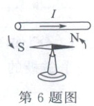 7. 小明同学把螺线管水平悬挂起来,闭合开关,发现螺线管缓慢转动后停了下来,改变螺线管 B 端的初始指向,重复操作,停止时 B 端的指向都相同。实验装置如图所示,闭合开关,螺线管停下来后 B 端指向(