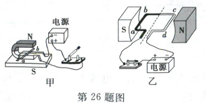 26. (6 分)如图甲所示为“探究通电导体在磁场中受力方向与什么因素有关”的实验装置。