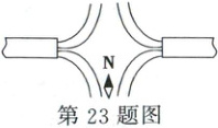 23. (3 分)如图所示,根据放在两个磁极间小磁针的指向,标出两个磁极的名称及磁感线的方向。
