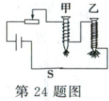 24. (3 分)在“探究影响电磁铁磁性强弱的因素”的实验中,小明用漆包线在大铁钉上绕若干匝,制成了简易电磁铁甲、乙,并设计了如图所示的电路,用此装置去吸引大头针。