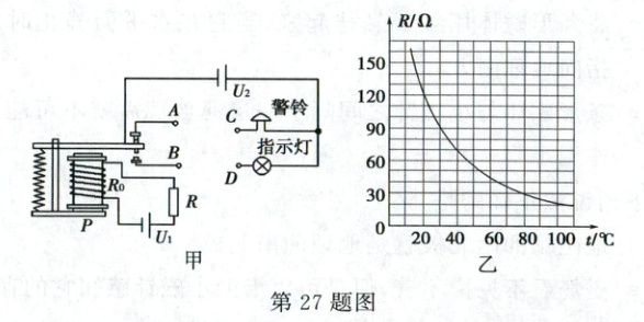 27. (6 分)小明利用热敏电阻设计了一个“过热自动报警电路”,如图甲所示。将热敏电阻 R 安装在需要探测温度的地方,当环境温度正常时,继电器的上触点接触,下触点分离,指示灯亮;当环境温度超过某一值时,继电器的下触点接触,上触点分离,警铃响。图甲中继电器的供电电压$ U_1 = 3 V,$继电器线圈用漆包线绕成,其电阻 R₀ 为 30 Ω。当线圈中的电流大于或等于 50 mA 时,继电器的衔铁将被吸合,警铃响。图乙是热敏电阻的阻值随温度变化的关系图像。