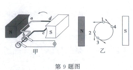 9. 图甲是发电机的原理示意图,图乙中的“○”表示图甲中的导线 $ ab $(观察的视线沿导线由 $ b $ 往 $ a $ 看),当它在磁场中分别转动到 1~4 位置时,运动方向已用箭头标出。下列说法正确的是(