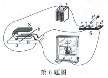 C 解析:P接c点时,电路中的电源、导体ab、开关构成通路,满足通电导线在磁场中受力的作用的条件,模拟的是电动机的工作原理,故A 正确,不符合题意;P接c点时,只调换磁极方向,根据通电导线在磁场中受力方向的影响因素可知,导体ab受力方向发生改变,运动方向发生改变,故B正确,不符合题意;P接d点时,电路中的开关、导体ab、灵敏电流计构成通路,将导体ab向上移动,导体ab未做切割磁感线运动,因此不会产生感应电流,灵敏电流计的指针不发生偏转,故C错误,符合题意;P接d点时,当导体ab做切割磁感线运动时,会产生感应电流,将机械能转化为电能,故D正确,不符合题意。