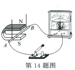 14. 如图所示是“探究什么情况下磁可以生电”的实验装置。实验时将开关、灵敏电流计与导线 $ AB $ 串联起来组成