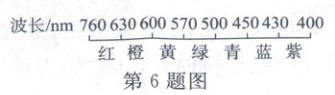 6. (2023·广州中考)各色光在真空中的波长如图所示,植物中叶绿素 a 会吸收波长在 430~662 nm 之间的光。真空中,波长 650 nm 的光(