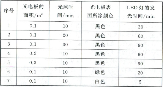 A. 先选用相同的三块面积为 0.1 m² 的光电板,在其表面都涂上黑色,正对太阳光,照射时间分别为 10 min、20 min、30 min,光电板吸收的能量被储存。让它们为相同的 LED 灯供电,并记录发光时间于表中。