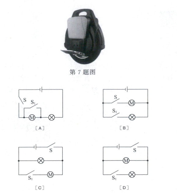 7. (5分)(2024·遂宁中考)图中的电动独轮车依靠电力驱动,低碳环保。当电源开关$S$闭合时指示灯亮起,独轮车处于待机状态,当人站在独轮车上时开关$S_{1}$自动闭合,电动机工作,独轮车才开始运动。下列电路设计符合上述要求的是(