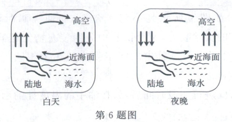 6. 炎炎夏日,小梅来到美丽的某海滨城市。她发现,在这里白天的风常常从海面吹向陆地,而每到夜晚风却从陆地吹向海面。她利用学过的物理知识进行分析,并画出陆地和海面之间空气流动情况的示意图,如图所示。形成这一现象的主要原因是 (