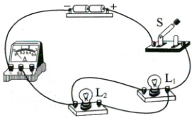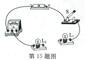 15. (5分)(2022·贵阳中考)如图所示是未完成连接的实物电路,请用笔画线代替导线完成该电路连接。要求:两灯并联,开关$S$同时控制两灯,电流表测量干路电流,导线不能交叉。