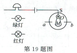 19. (5分)(2022·达州中考)某船上装有平衡警示电路,其中$S$为重力开关,金属片$M可绕O$点自由转动。当船水平时,$M在a$、$b$中间;当船左倾到一定程度时,绿灯亮,电铃响;当船右倾到一定程度时,红灯亮,电铃响。请完成电路图。