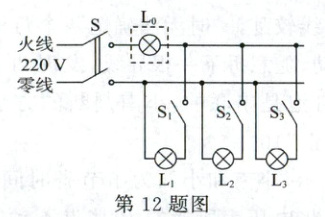 12. (5分)在楼房竣工通电前,电工通常要检查家庭电路的安装是否存在故障。常用一个标有“220V 40W”字样的灯泡L₀(检验灯泡)取代保险丝来检查新安装的照明电路中每个支路的情况,如图所示。当只闭合S、$S_1$时,L₀不亮;当只闭合S、$S_2$时,L₀和$L_2$都呈暗红色;当只闭合S、$S_3$时,L₀正常发光。由此可以判断(
