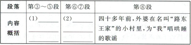(2)儿时夏夜庭院里,母亲唱歌谣哄"我"和弟弟入睡 18. 交代本文的主要内容——记忆里关于亲情的歌声,是贯串全文的线索,激发读者的阅读兴趣。 19. 运用比喻的修辞手法,把记忆里的歌声比作鸟雀,生动形象地写出了歌声的美妙动听,表达了作者对记忆中的歌声的喜爱和怀念之情。 20. 运用了人物描写和环境描写。作用:生动形象地写出了乡村人情的和谐美好与暮色的丰富美丽,营造了祥和美好的氛围,突出了老父亲唱着歌背着孙女回家这个画面的温馨美好,抒发了作者对过去美好回忆的怀念和赞美之情。 21. (示例一)赞同用手机哄孩子。这种方式便捷、有效,能尽快地让孩子安静下来,避免在公共场合打扰到别人,但要注意不能过于频繁使用。 (示例二)赞同用歌声哄孩子。这种方式能够更好地让孩子感受到来自亲人的关爱,增进彼此之间的感情,留下美好的回忆,带给孩子关于音乐美的熏陶,有利于文化的传承。