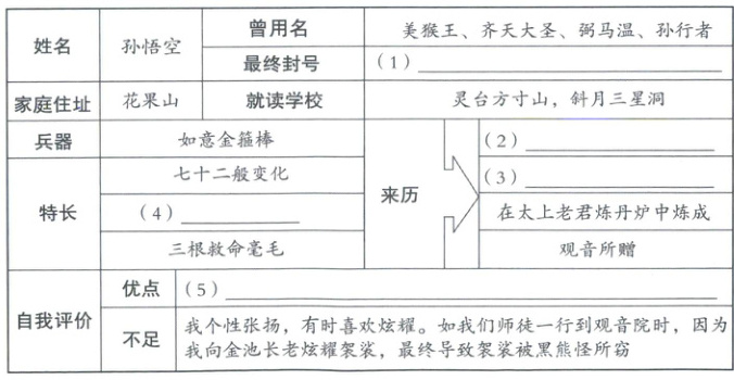 4. 灵山雷音学院要评选“最美西游人”,请你根据《西游记》内容,帮孙悟空填写申请表。(5分)