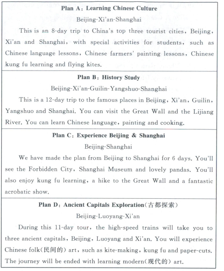 )17. What can you experience if you choose Plan A? ①Chinese language lessons. ②Chinese folk art.
