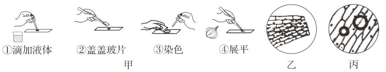 8. 小敏进行了“制作并观察洋葱鳞片叶内表皮细胞临时装片”的实验,图甲是实验的部分操作步骤示意图,图乙和图丙是显微镜下观察到的不同物像。请据图回答下列问题。