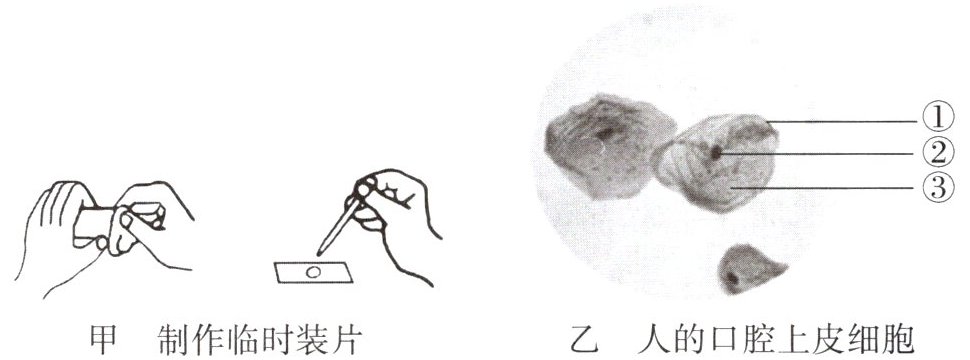 5. 细胞是构成生物体的基本单位,我们对细胞进行观察时,需制作临时装片。图甲为制作人的口腔上皮细胞临时装片的部分过程示意图,图乙为观察结果。请据图回答下列问题。