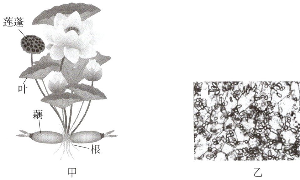 (填“导管”或“筛管”)运输到藕中储存。图乙是藕细胞的显微结构图,可以看出细胞体积大、内含丰富的淀粉颗粒,推测其属于营养